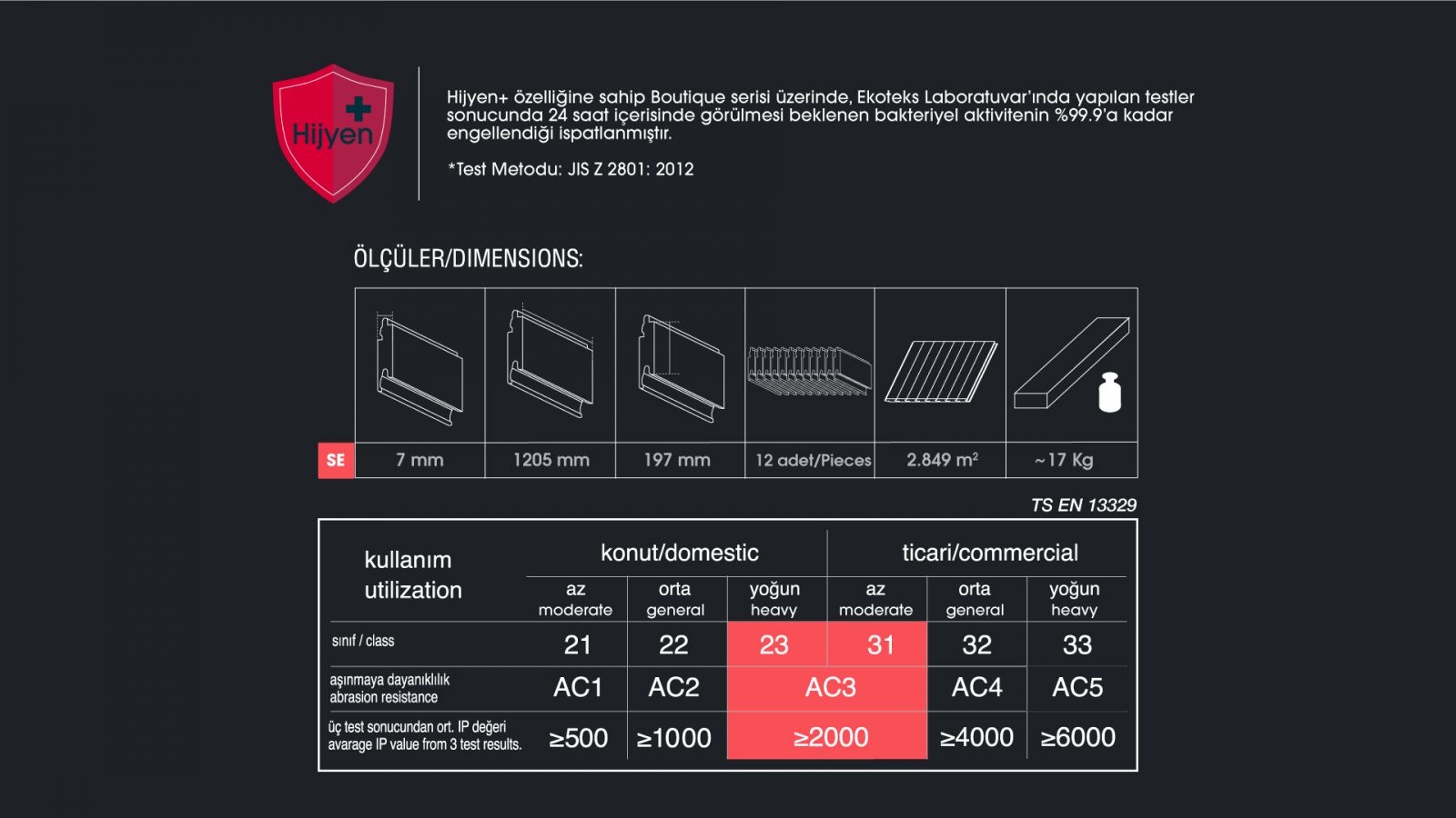 | · · Kalınlık :7 mm · En :197 mm · Boy :1205 mm · Sınıf :AC 3 |