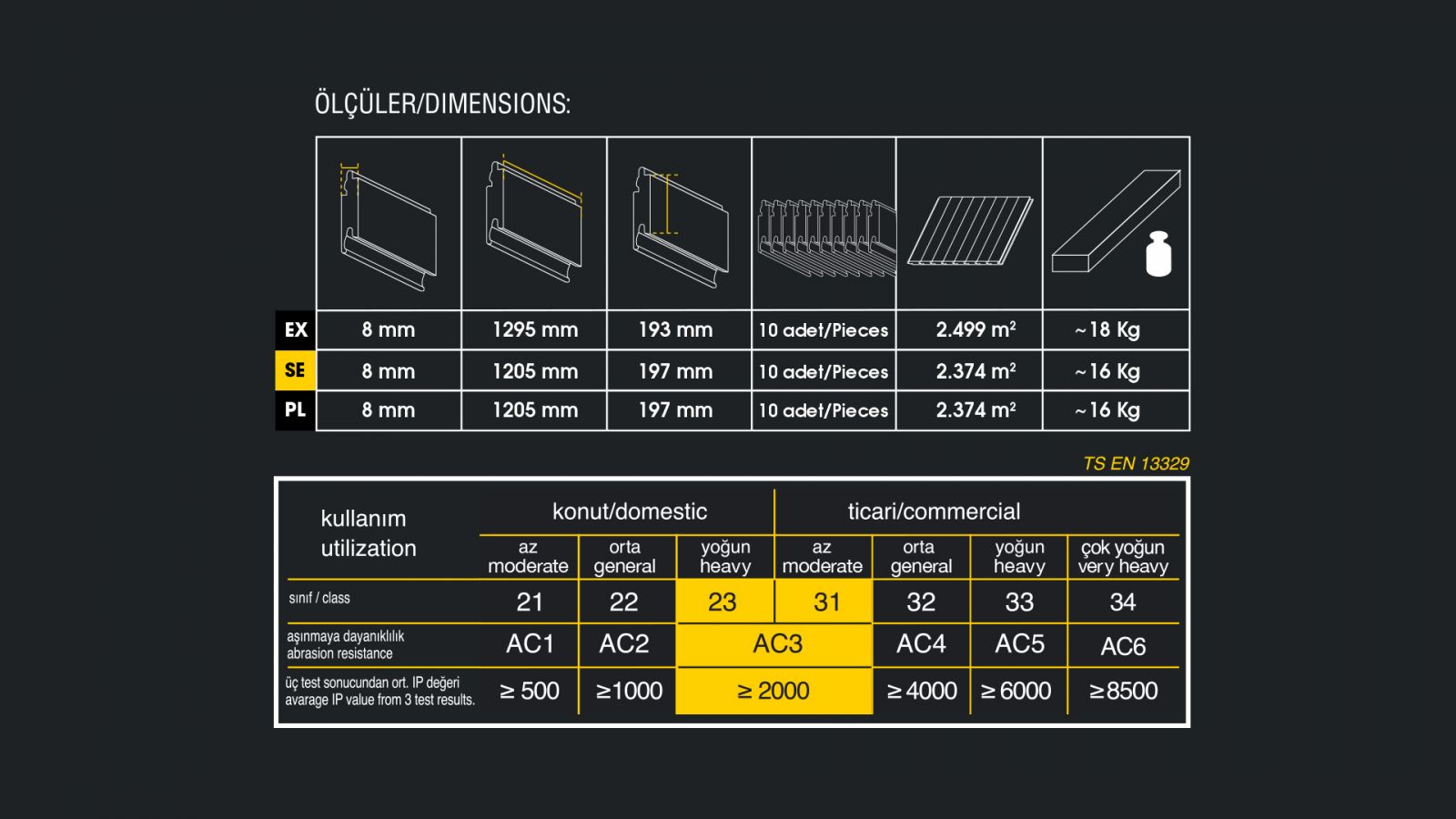 | · · Kalınlık :8 mm · En :197 mm · Boy :1205 mm · Sınıf :AC 3 |