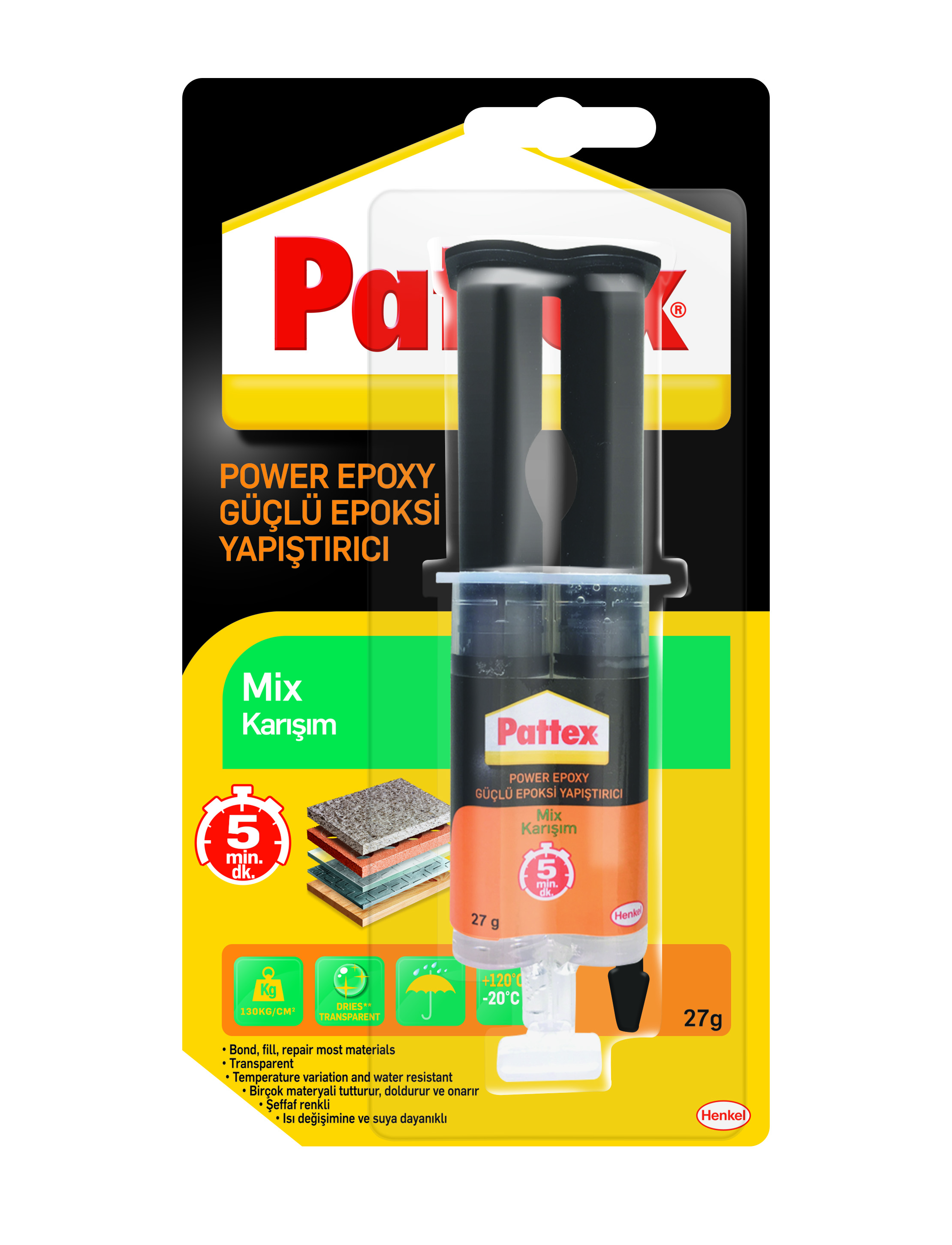 ÖZELLİKLER: • EBAT : 27 Gr • RENK : Şeffaf • SERTLEŞME SÜRESİ : 6 Saat Sonunda • İLK SERTLEŞME : 20 Dakika • ISI DAYANIMI : -40°C ile 120°C arasında • ÜRÜNÜN AVANTAJLARI : Dozaj Donanımı Sayesinde Zayiat Önlenmektedir. Boya ile Renklendirilebilir. • UYGULAMA : Yapıştırılacak Yüzeyler Her Türlü Kir, Yağ Ve Tozdan Arındırılmış Olmalıdır. Dozaj Donanımının İki Ucunu Kesin. Pistonları İterek, Komponentleri Eşit Oranda Çıkartın. Dikkatlice Karıştırın. Karışımı Yapışacak Her İki Yüzeye İnce Bir Tabaka Halinde Sürün. Her İki Parçayı Birbirine Yapıştırın ve Birkaç Dakika Boyunca Tutun. Yapıştırılan Parça 20 Dakika Sonra Kullanılabilir. Taşan Yapıştırıcıyı Derhal Silin ve Her Kullanımdan Sonra Aletleri Sıcak Su ile Yıkayın. • KULLANIM ALANLARI : Metal, Mermer, Seramik, Cam, Taş, Ahşap, Deri, Plastik Yapıştırmak İçin Kullanılır.Yorum Bulunamadı.
