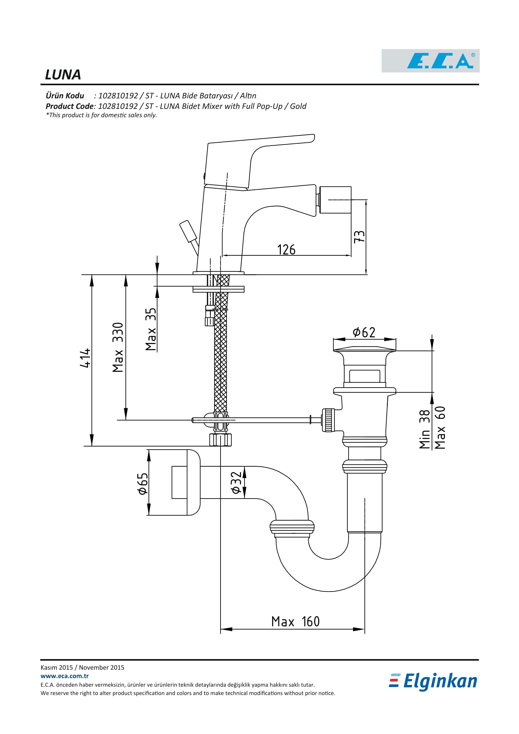 • Çıkış Ucu Yüksekliği : 73 MM